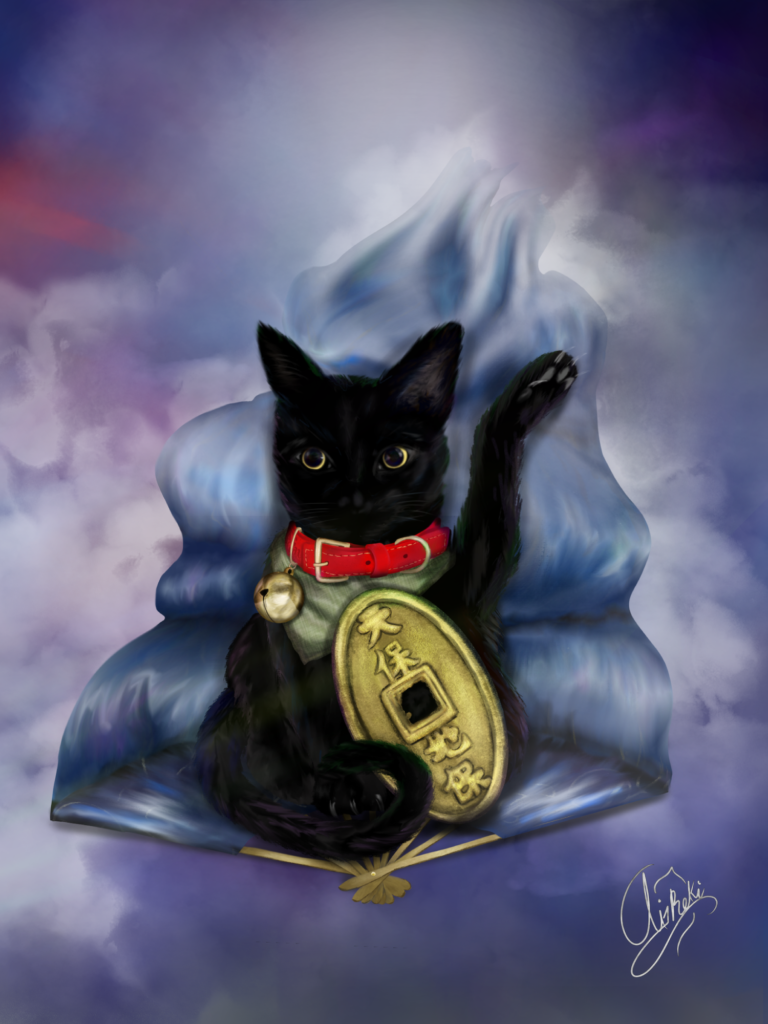 En la búsqueda de símbolos de la suerte, pensé en el Maneki-neko japonés, asociado con la prosperidad. Sin embargo, el dibujo tomó otro rumbo: decidí reinterpretarlo usando a mi propio gato, Mixy, como modelo